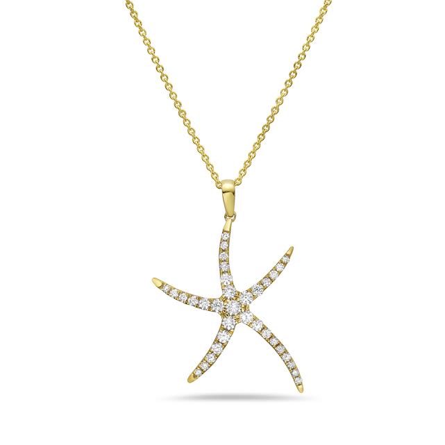 Make a sparkling statement with this stunning 14K Starfish Pendant, featuring 34 brilliant diamonds (1ct). Suspended from an 18-inch cable chain, this pendant is a celestial tribute to the ocean's beauty and magic.