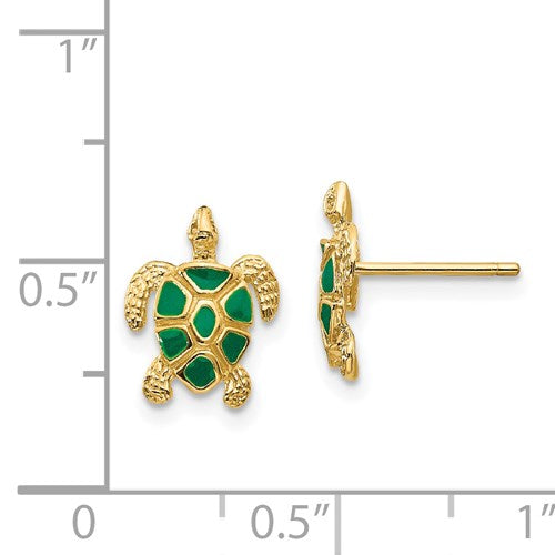 Dive into the world of coastal chic with these stunning 14K gold green enameled sea turtle post earrings, featuring: