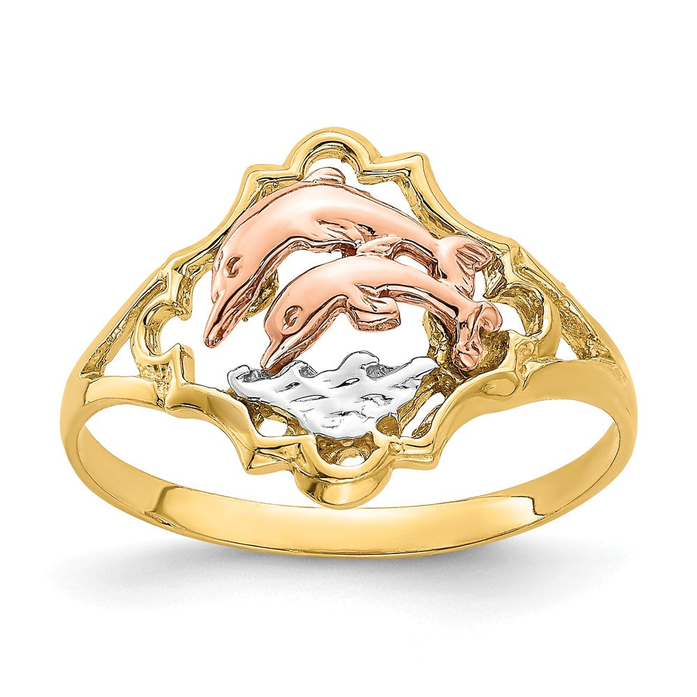Double the dolphins, double the charm. This playful ring showcases two beautifully detailed dolphins leaping through rhodium-plated waters, framed in radiant 14K yellow and rose gold. A graceful blend of tones and textures, it captures the energy of the ocean with elegance and whimsy.