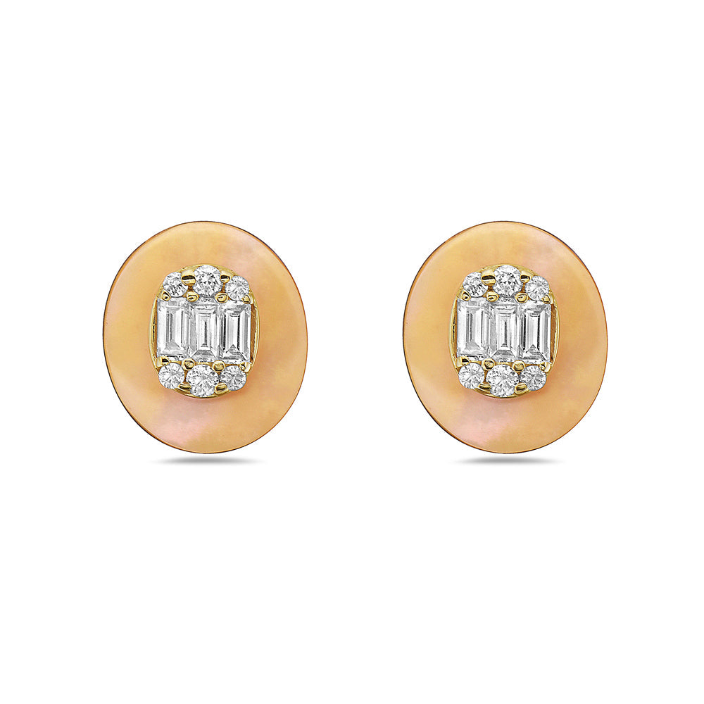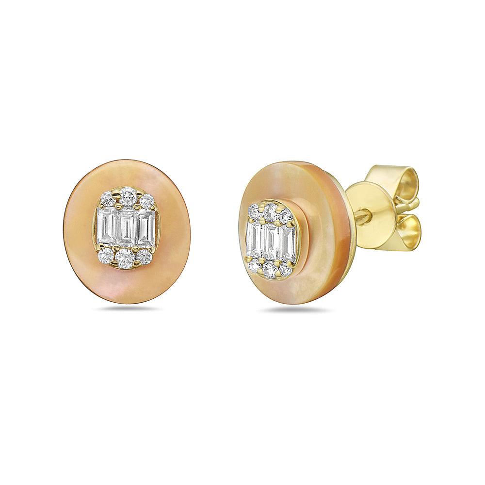 Experience timeless sophistication with these exquisite 14K yellow gold mother of pearl stud earrings, showcasing 18 sparkling round diamonds (0.133ct) and 6 elegant baguette diamonds.