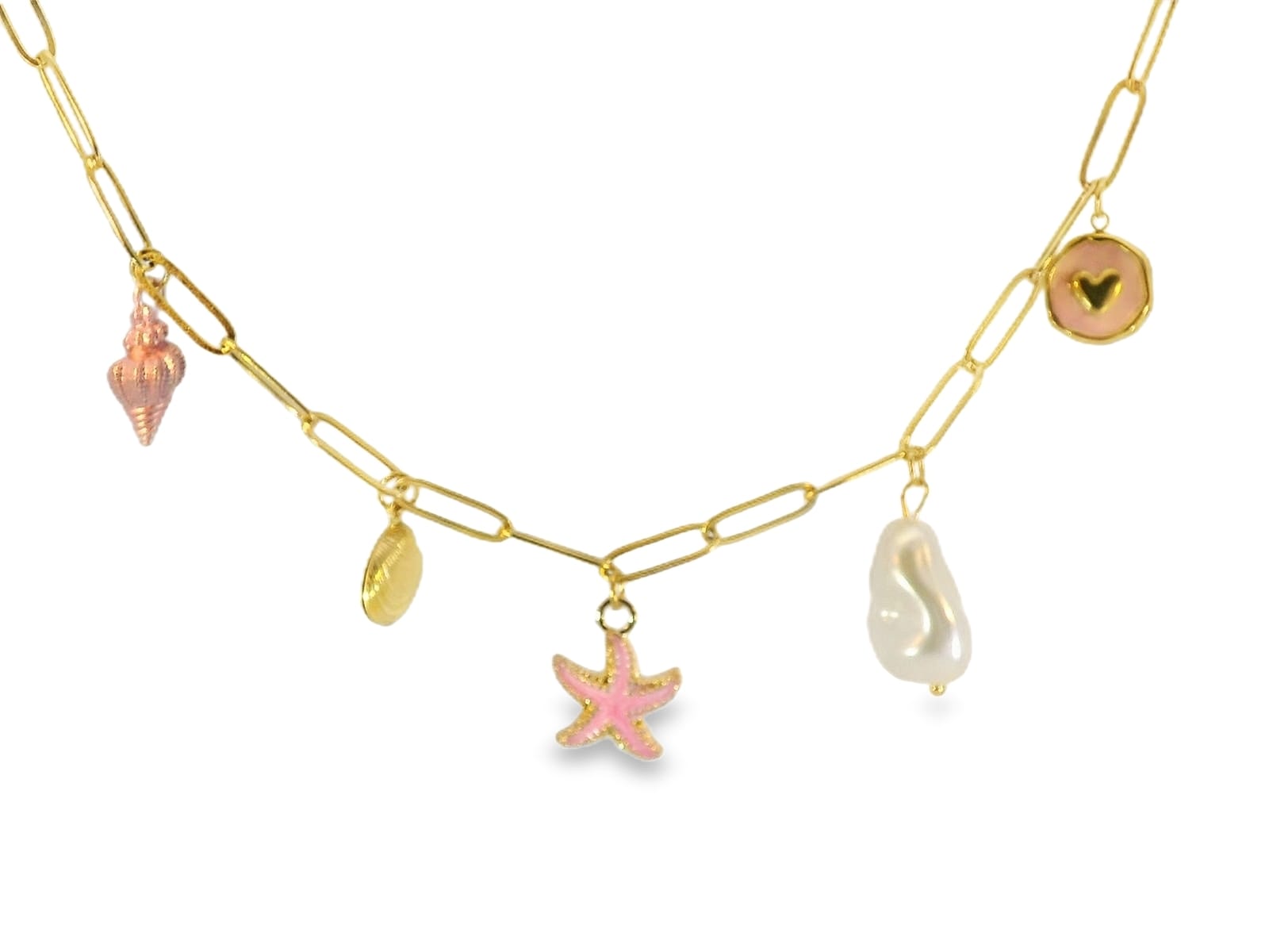 Bring the beach with you wherever you go. This delicate 18K gold plated charm necklace is a graceful blend of whimsy and elegance, featuring a gold and pink starfish, a tiny shell, and a luminous water pearl. Each charm is thoughtfully designed to capture the beauty of the ocean.