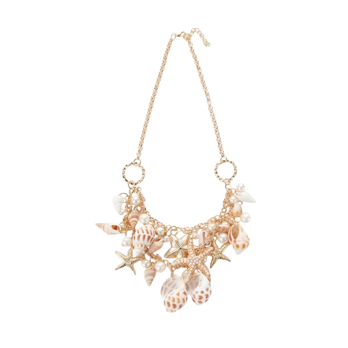 - Features a graduated layering design with starfish, sea pearls, and shell charms.