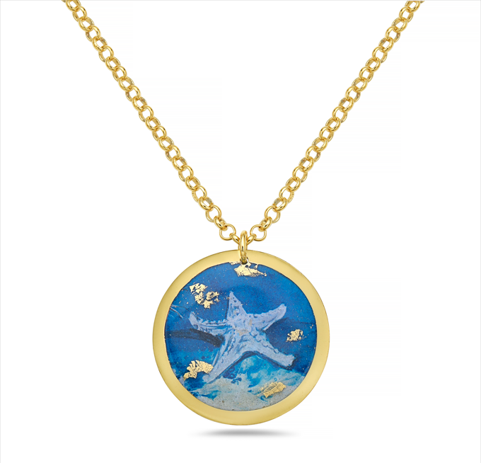 Embody the essence of the ocean with this stunning Blue Starfish Necklace, intricately crafted with 22K gold leaf.