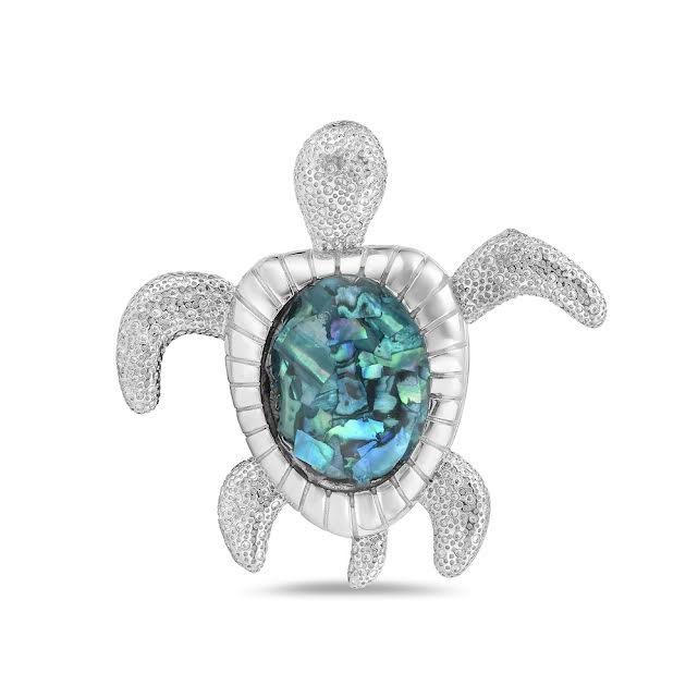 Introducing our contemporary Ocean Dream Sterling Silver Turtle Pendant. Crafted in sterling silver with hand-applied teal abalone and a clear glass-like finish, this 41x39mm pendant is suspended on an 18-inch chain.