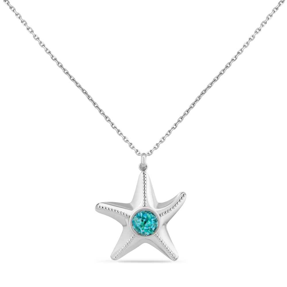 Celebrate the serene beauty of the sea with the Sterling Silver Sleeping Beauty Starfish Pendant. Crafted in sterling silver and featuring stunning Sleeping Beauty turquoise and Mother of Pearl accents, this pendant brings a fresh coastal elegance to your jewelry collection.